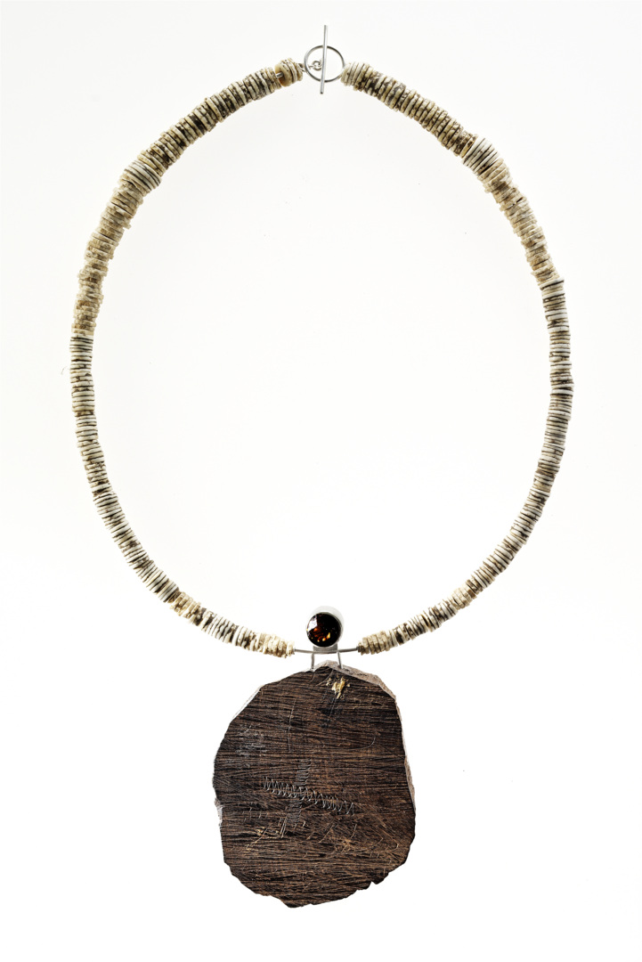 Anhänger "Meditation2" 2009, Ebenholz, Silber, Rauchquarz, Strausseneiperlen